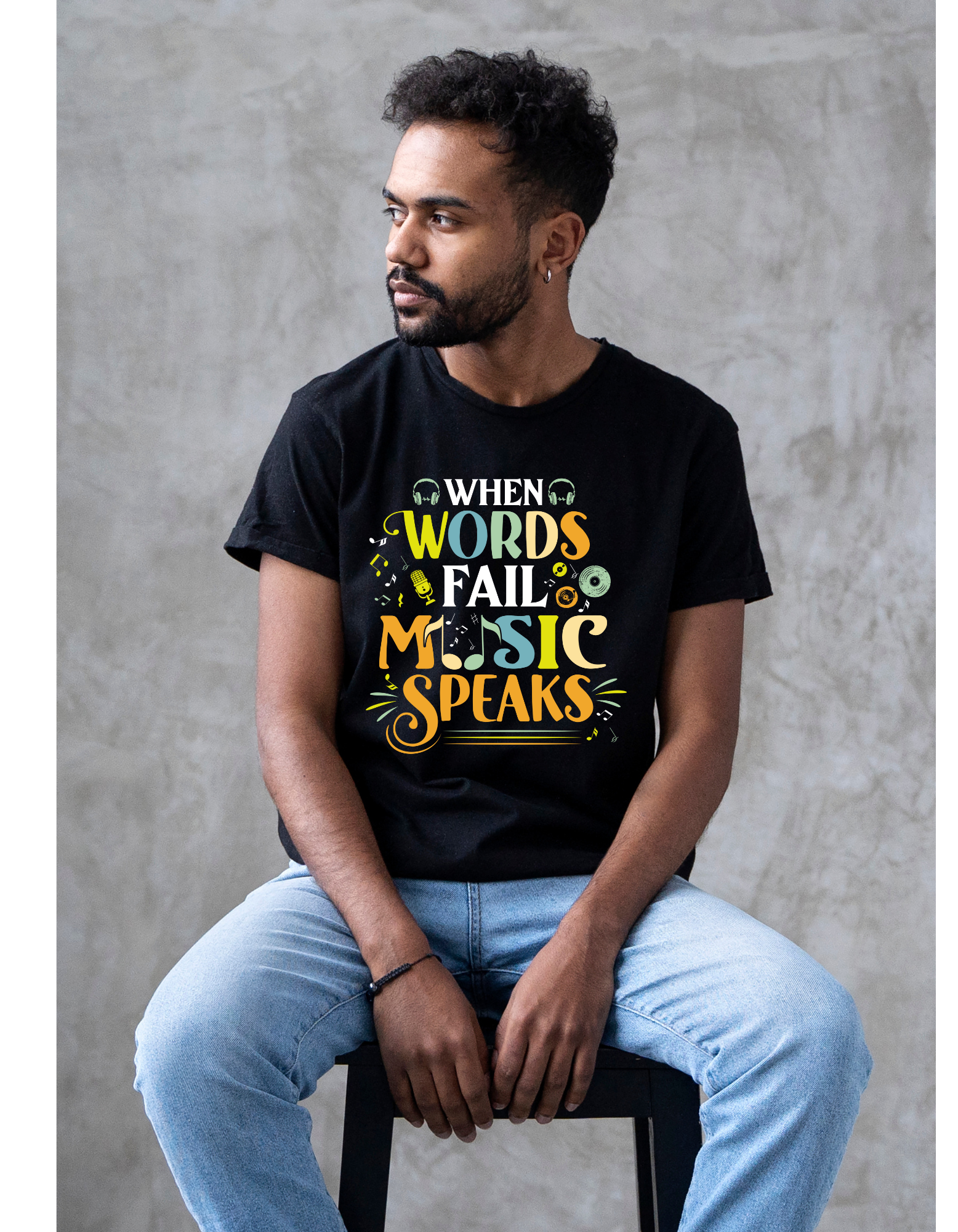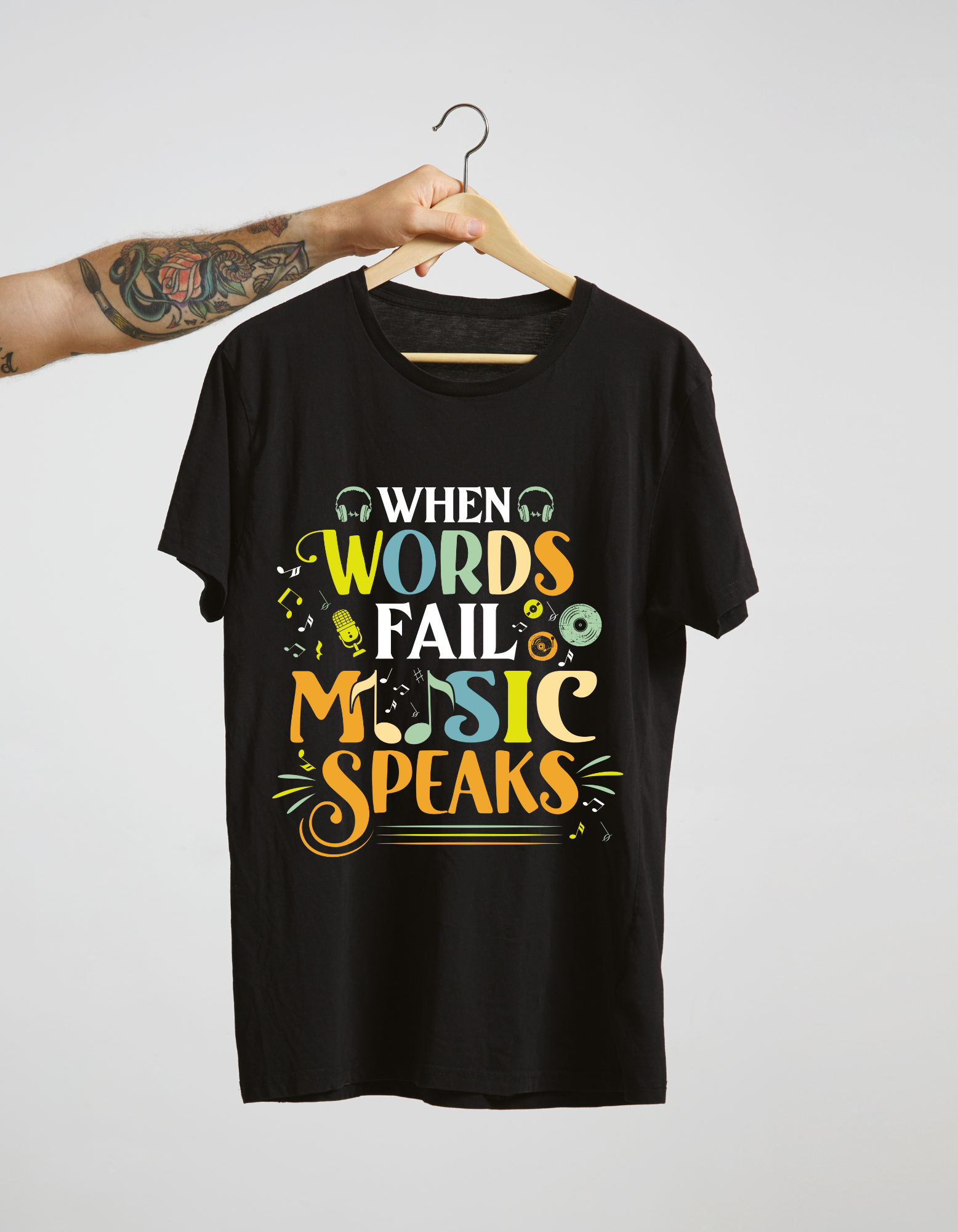 Let your style speak volumes with this expressive design. Bright, playful typography meets a heartfelt message: 'When words fail, music speaks.' A perfect tee for those who feel deeply and live musically.